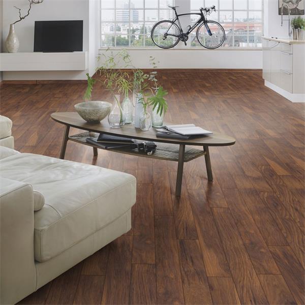 Introducing Red River Hickory, a 10mm laminate flooring featuring a V-groove on all four sides for an authentic wood floor aesthetic. It's installed with an upgraded click-fit system, and its AC5 rating makes it perfect for heavy use in both homes and commercial spaces.
