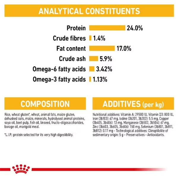 Your dog’s skin is its largest organ, protecting against irritants. ROYAL CANIN Medium Dermacomfort is designed for adult dogs (11–25kg) with sensitive skin. Its reduced-allergen formula, rich in Omega-3 and Omega-6 from fish and vegetable oils, soothes skin and supports a healthy coat. Low-allergen proteins reduce the risk of allergies.
