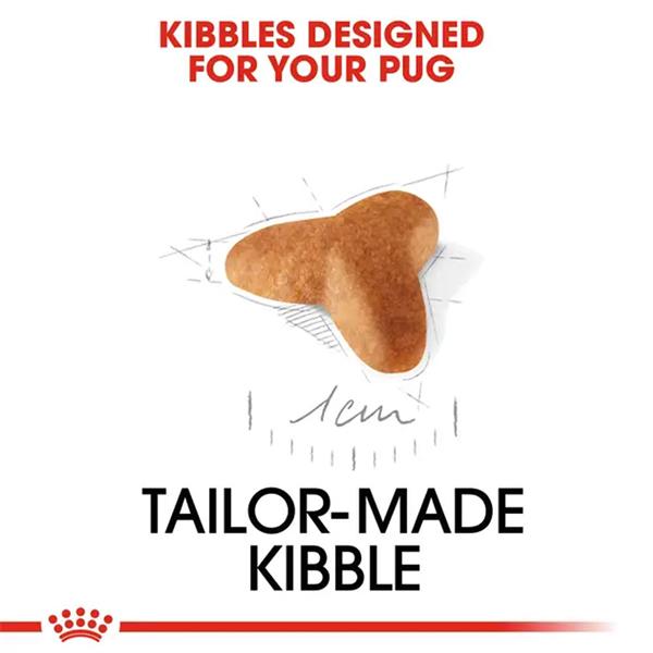 The kibble is uniquely shaped to suit the Pug’s short, flat muzzle, making it easier to pick up and encouraging thorough chewing.