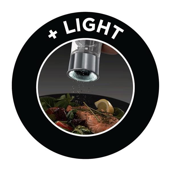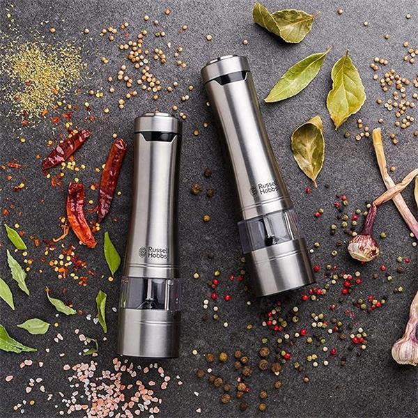 Equipped with a simple one-handed operation, the grinders are easy to use, making them perfect for adding fresh seasoning to your meals with minimal effort. The transparent window in each grinder lets you easily monitor the contents, ensuring you never run out unexpectedly. Both grinders are battery-powered, providing convenience without the need for manual effort, and the built-in LED light illuminates the grinding area for precise seasoning. With their modern brushed steel finish, the Russell Hobbs Salt and Pepper Grinder Set brings both functionality and a touch of sophistication to your kitchen or dining space.
