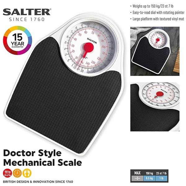 This Mechanical Scale from Salter features a large, easy-to-read dial displaying both imperial and metric measures, capable of weighing up to 150 KG. Hassle-free and reliable, these scales are ideal for any bathroom, offering precise and accurate readings with dimensions of 43 x 32 x 7cm. Requiring minimal maintenance, simply step onto the scale to view your weight measurement, as no batteries are necessary. Constructed with a sturdy, solid base and an anti-slip vinyl mat, this traditional scale provides a spacious standing platform with ample foot room. Note: Ensure accurate results by ensuring your feet do not touch the plastic dial or circle rim. To reset the scale to zero, adjust the needle using the dial located beneath the platform; tap the platform and readjust as needed.