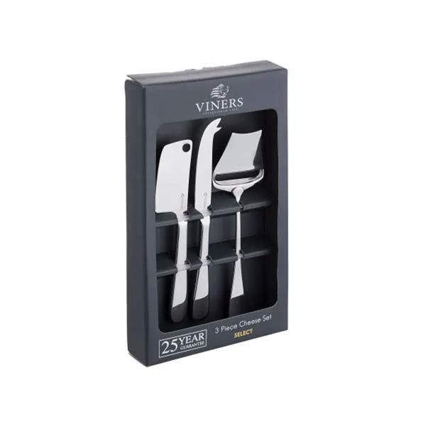 The Viners Select 3-Piece Cheese Set is an essential addition for any host, featuring three specialised knives—a pronged knife for soft cheese, a sturdy blade for hard varieties, and a slicing knife—all crafted from high-quality 18/0 mirror-polished stainless steel. Dishwasher safe and backed by a 25-year guarantee, this durable set comes elegantly packaged in a matte black and silver foil gift box, making it a perfect present for cheese enthusiasts.