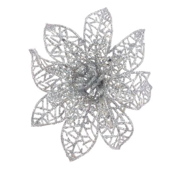 The floralsilk Silver Glitter Poinsettia Clip 15cm is a dazzling embellishment, perfect for adding a touch of festive sparkle to your Christmas tree or floral arrangements.