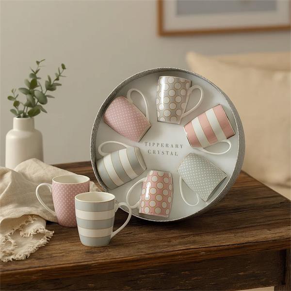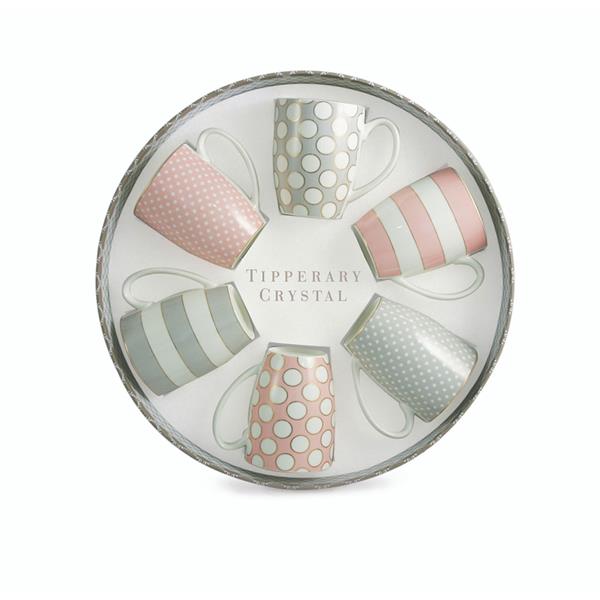 The Tipperary Crystal Coloured Spots Set of 6 Mugs is a vibrant and stylish collection of bone china mugs, each adorned with playful coloured spots that bring a cheerful, contemporary, and eye-catching element to any table setting. The mugs are carefully crafted from high-quality materials, offering excellent durability while maintaining a refined and elegant appearance, ensuring they can be used daily without losing their charm. Each mug features a comfortable handle designed for easy gripping, and smooth, polished surfaces that make cleaning effortless, whether by hand or in the dishwasher. The coordinated set of six allows for a cohesive and visually appealing presentation, making it ideal for serving tea, coffee, or other hot beverages to family and guests, or as a thoughtful gift for birthdays, housewarmings, or special occasions. The playful coloured spots are complemented by subtle detailing that adds sophistication, making these mugs suitable for both casual and formal settings. Combining practicality, style, and timeless charm, the set enhances any kitchen or dining space, offering a perfect balance between functionality and decorative appeal, while brightening the table with colour and personality during everyday use or celebratory moments.
