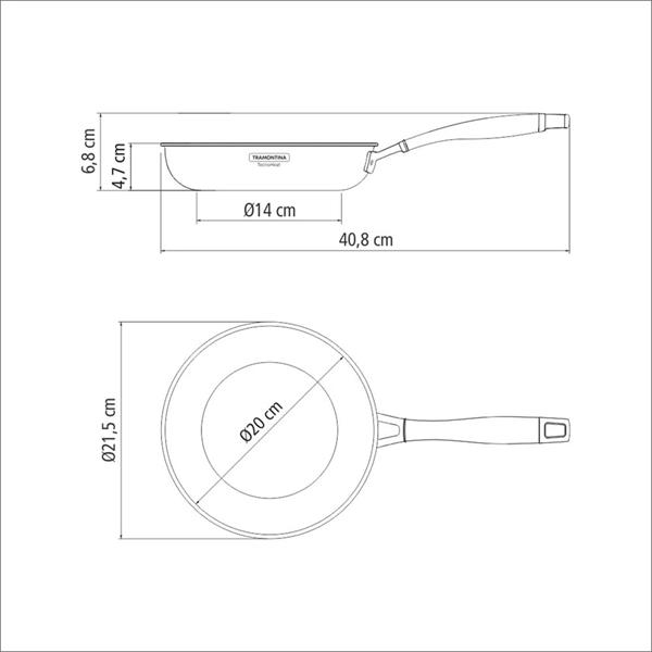 Product dimensions (length with handle x width x height): 40.8cm x 21.6cm (20cm internal diameter) x 6.8cm