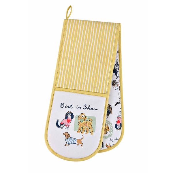 The Best in Show Double Oven Glove is a playful and practical addition to your kitchen essentials, designed for those who appreciate both style and functionality. Featuring a delightful pattern of dogs in various poses, this oven glove adds a touch of charm to your cooking space. Made from high-quality cotton with a soft, padded lining, it provides excellent protection against heat when handling hot dishes, trays, or pots. The double glove design ensures full coverage for both hands, offering comfort and security while you work in the kitchen.