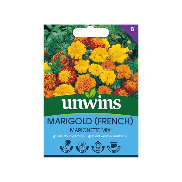 Unwins French Marigold Marionette Mix Seeds produce stunning pompon-shaped flowers in a vibrant mix of colours, perfect for adding a splash of brightness to sunny borders or patios during summer.