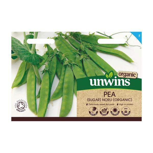 Unwins Organic Sugar Pea Norli Seeds yield sweet and tender peas with flat, stringless pods, perfect for early-season harvests. This mangetout variety offers exceptional flavour and versatility.