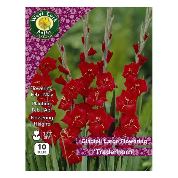 The Traderhorn Gladioli is an iconic and high impact garden classic, world renowned for its colossal flower spikes and its intense, primary red brilliance. This variety is the epitome of the large flowering group, producing monumental, sword like stems packed with up to 20 individual blossoms. Each bloom is a masterpiece of saturation, featuring velvety, scarlet red petals accented by a sharp, contrasting white flash at the throat. Rising with stately, architectural precision above fans of sturdy, mid green foliage, Traderhorn is the ultimate choice for gardeners looking to add vertical drama, unapologetic colour, and a touch of mid century glamour to sunny borders and cutting gardens.