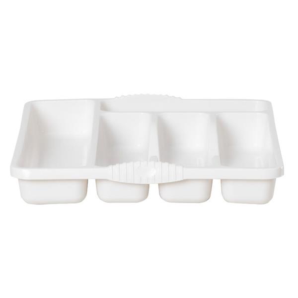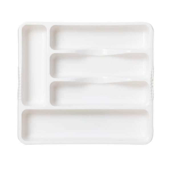 This compact white cutlery tray features five compartments to neatly organise your everyday utensils and is made from durable, easy-to-clean plastic with a stylish high-gloss finish.