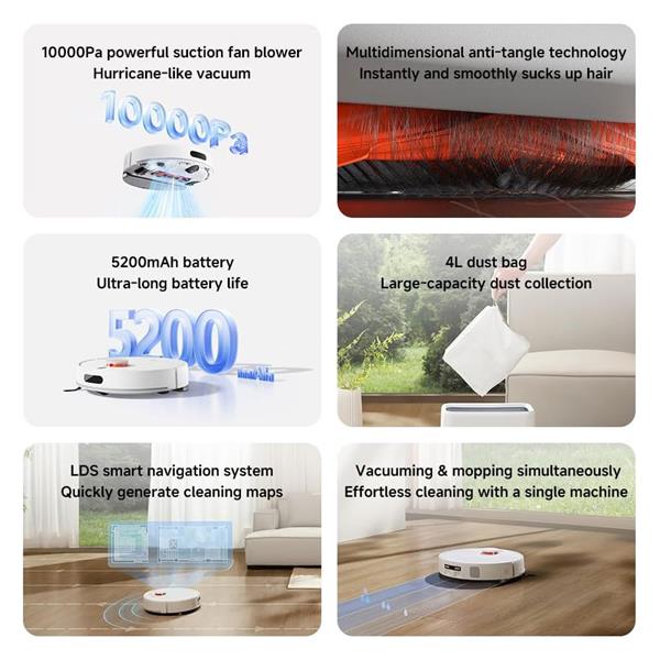 The Xiaomi robot vacuum delivers high-performance cleaning through a combination of extreme suction power and long-lasting battery life. Designed to operate autonomously for extended periods, it features an advanced anti-tangle system to maintain efficiency and a high-capacity base that minimises the need for manual maintenance, making it an ideal solution for busy households.