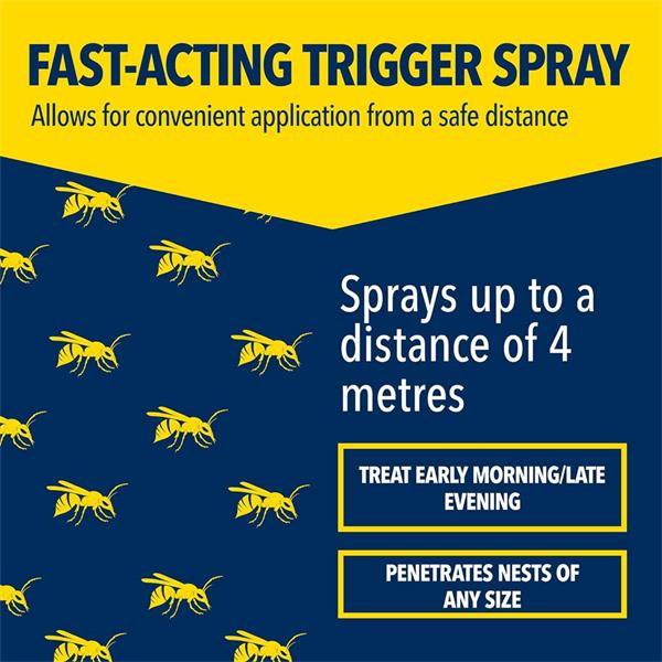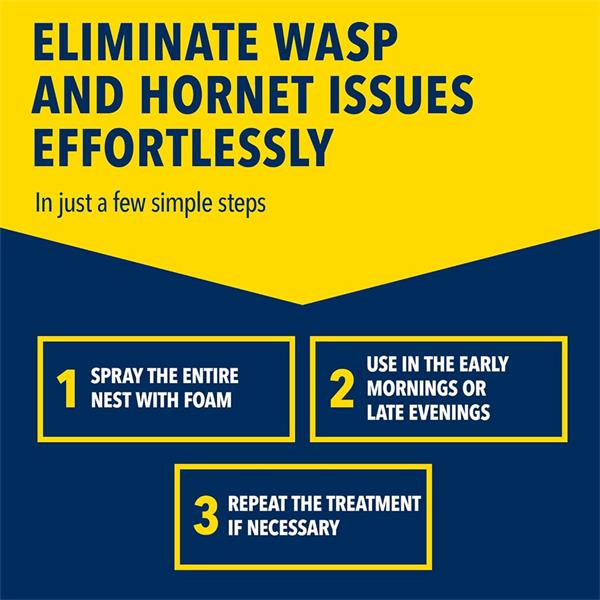 Apply the foam in the late evening when wasps are less active and most of the colony is inside the nest. The fast-acting formula knocks down wasps within seconds and kills them within minutes, offering an efficient and thorough solution.